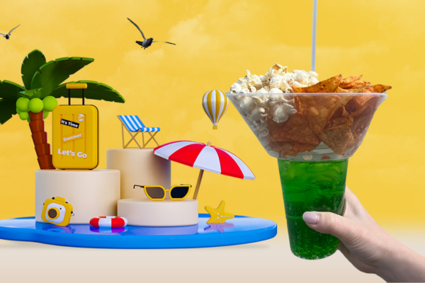 片手で飲み物とスナックボウルを持ててしまうこの画期的な容器は見た目のインパクトも大です。